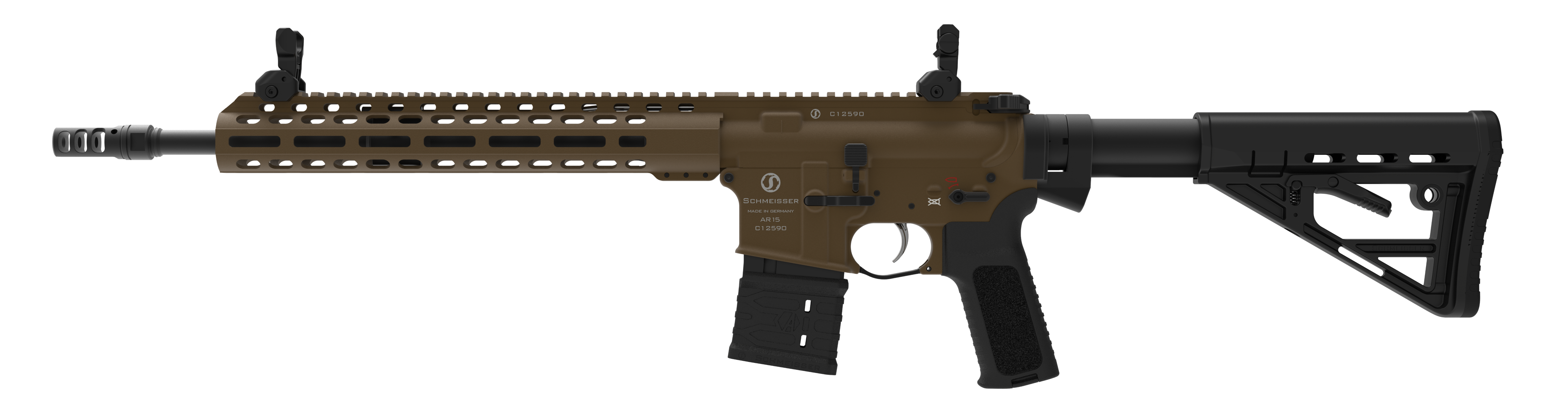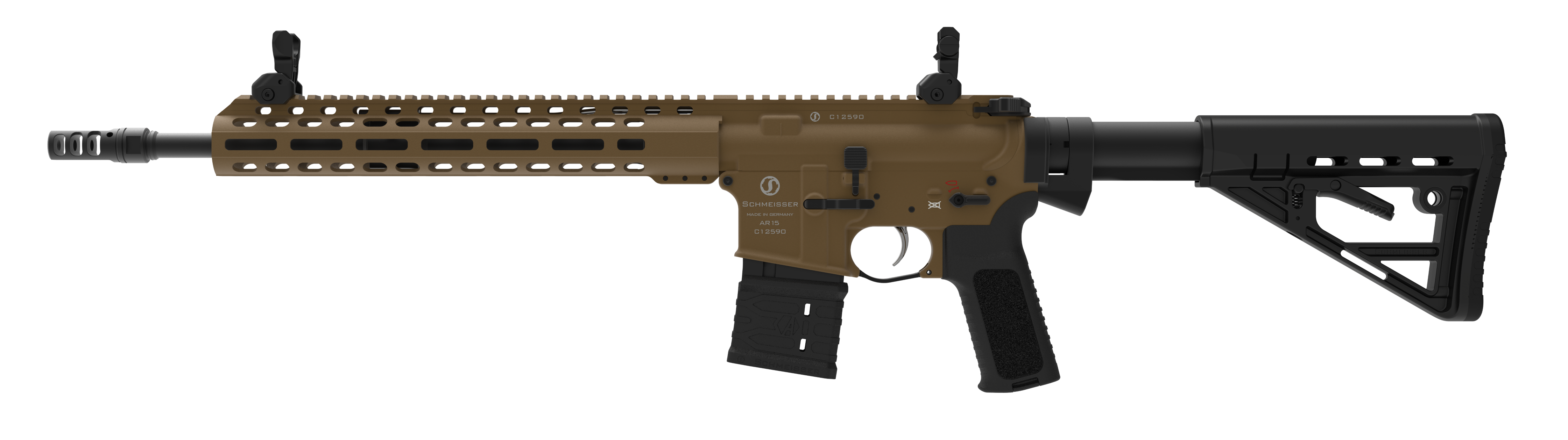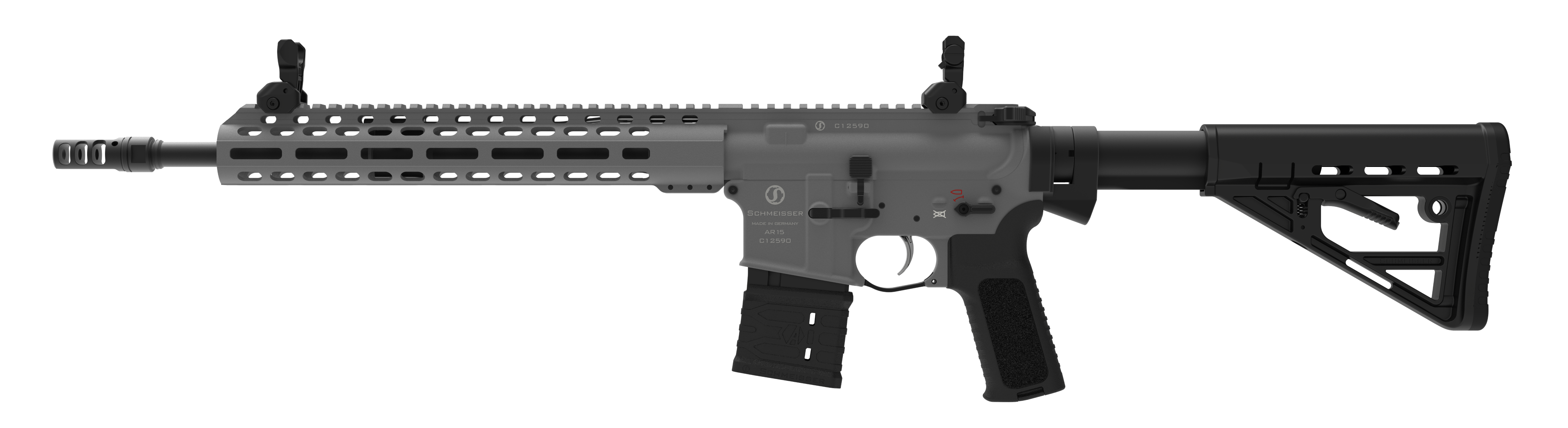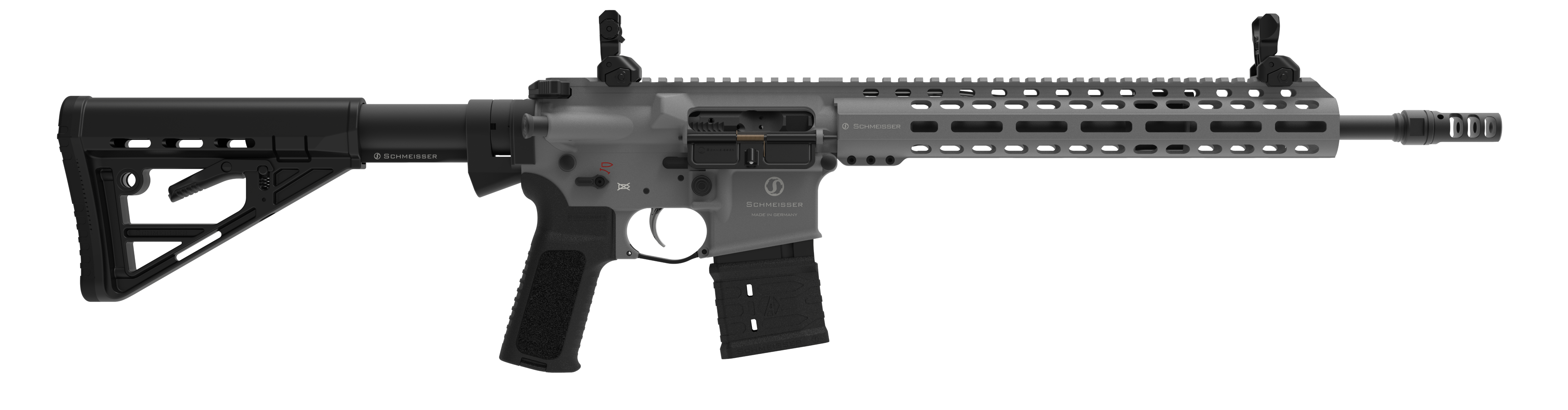 Full Ambidextrous Design, 100% MilSpec, Schmeisser Charging Handle with gas ports and extended wings, 45°/90° safety, Ambi Bolt Catch, Schmeisser Multi Wire silent buffer system, Solid buffer tube (MilSpec tube), 6-pos. buttstock and Schmeisser polymer pistol grip